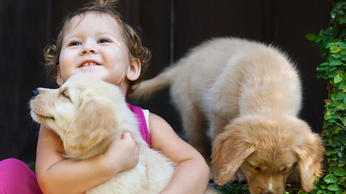 Golden Retriever puppy giving a toddler a kiss.Image via Shutterstock / Kitreel