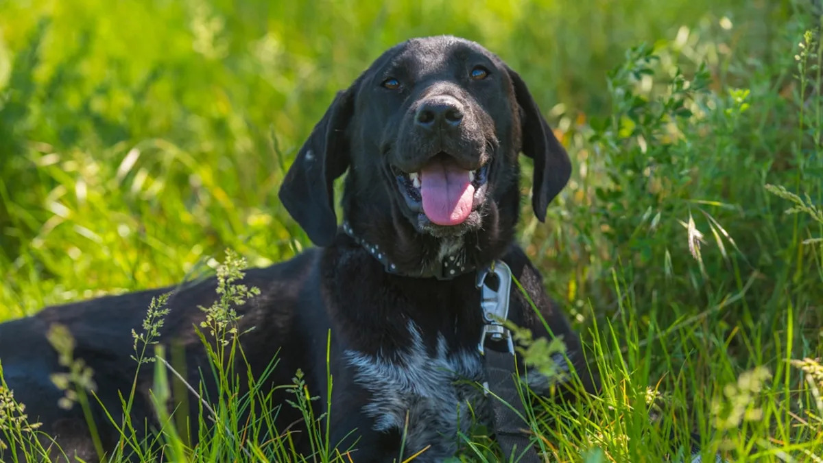 A happy Black Lab lies in the grass with a smile.Image via Unsplash