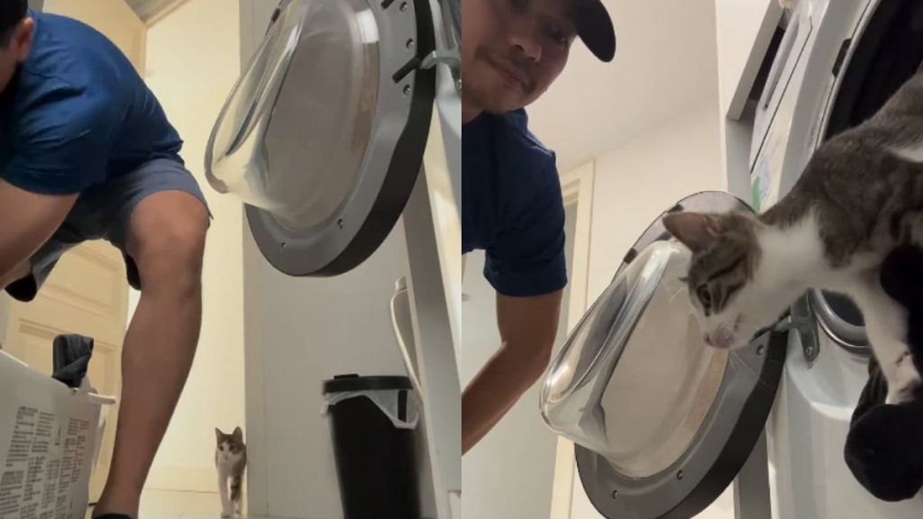 In a video shared by @hellomochicito on Instagram, a cute cat is seen “micromanaging” the owner as he tries to do laundry. The clip begins with the man loading clothes into the washing machine, while his feline quickly approaches to check if he’s doing everything correctly. The kitty doesn’t stop there. He even climbs into the washing machine, tossing some clothes out.