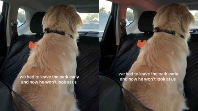 His parents are chatting away in the front, trying to explain themselves, but Brew refuses to budge. Not a glance, not a tail twitch, nothing. When his mom says, “Tell me you have a dramatic golden retriever without telling me,” it suddenly clicks. They left the dog park early, and Brew is staging a full-scale emotional protest.