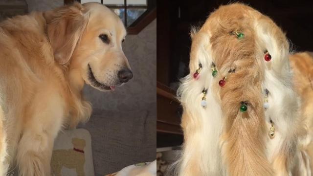 Chili, a Golden Retriever, ended up receiving his own holiday makeover thanks to his owner’s sense of humor. Determined to decorate every corner of the house, Chili’s mom realized she had overlooked one very important “item” — her dog.