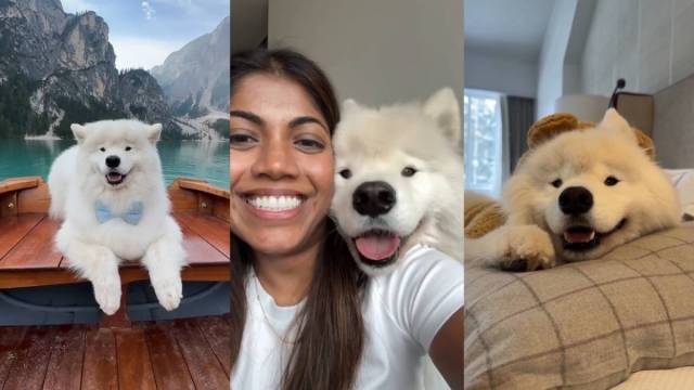 In a cute dog video on Instagram, an owner captures moments with her Samoyed named Boomer, who smiles on command. It begins with the dog mom recording in selfie mode with her furbaby clinging over her shoulder. The pup rests his head over his human’s shoulder and sticks his face with her.