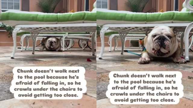 What’s remarkable is how quickly this little moment of backyard drama went viral; the video has racked up over 8.3k likes, and it still feels like people are discovering Chunk’s tactical genius every hour. The moment his owner pans the camera down, you see precisely how committed he is to his mission. Instead of walking past the pool like a normal dog, he drops into a determined crawl. He scoots under the deck chairs like he’s navigating an obstacle course designed specifically to protect him from imaginary danger.