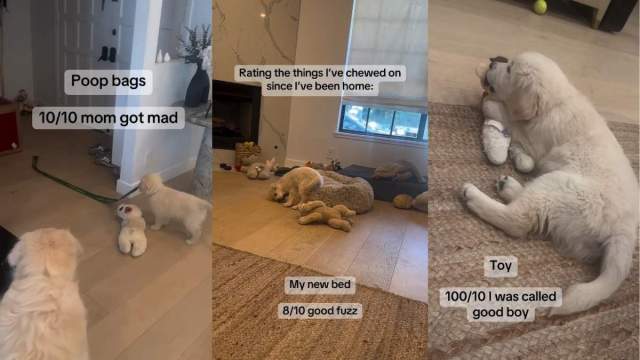 The pup gives his new bed an 8 out of 10, noting that it has “good fuzz.” The video then shows him licking his dad’s hands and rating them a 6 out of 10, complaining that his dad keeps taking them away from him. Meanwhile, the poop bags receive full marks. As expected, the toy earns an impressive 100 out of 10, clearly showing how much he loves playing with it.