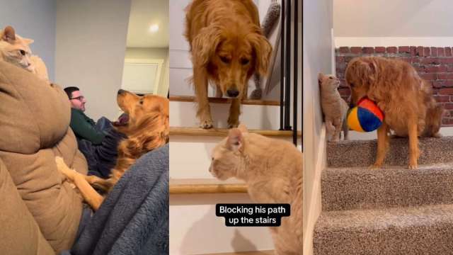 In a funny and cute dog video on Instagram, a Golden Retriever named Maple shows her “favorite pastime,” which is “rage-baiting Waffles,” the cat. It begins with the orange kitty sitting on the head of a couch while Maple tries to reach him. Waffles whines seeing his dog sister’s antics. Next, viewers can witness the golden fur baby “blocking his oath up the stairs.” She doesn’t let her cat brother pass.