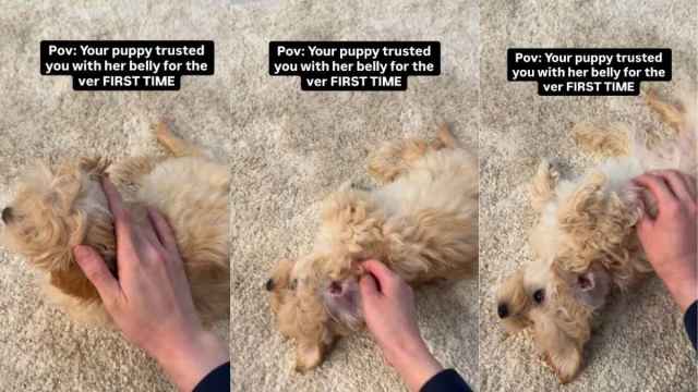 In an adorable dog video on Instagram, a Maltipoo puppy shows her trust in her owner with belly rubs for the first time. It begins with the fur baby, Duffy, sitting on a carpet floor while the human lovingly pets her. As the owner continuously showers love with gentle pats and scratches, the pooch looks up and sees the person who is making her comfortable.