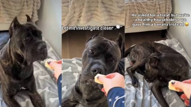 The reel was shared by @kodacorso, a Cane Corso account with over 13K followers. In the video, Koda lounges on a cozy blanket beside the bed while his owner offers him a banana. The caption reads, “He got his treat anyway ??,”, so the swap does not last forever. Still, Koda makes it clear he expected something better, and he refuses to play along.