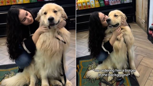 Furthermore, the Golden meets the store girl who is equally excited to meet her fluffy friend. The canine looks for ways to cling to her, and the lady comes closer to give him some pets and kisses. Duke enjoys the cuddles from his friend while his mom orders a burger for him in the background. The pup smiles as the girl continues showering him with affection. Then, the dog receives some delicious treats from her. The woman feeds the fur baby some chocolates from her hands, who has a good time playing with her.