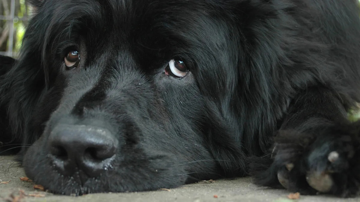Closeup of a sad Newfoundland dog lying on the floor.Image via Unsplash
