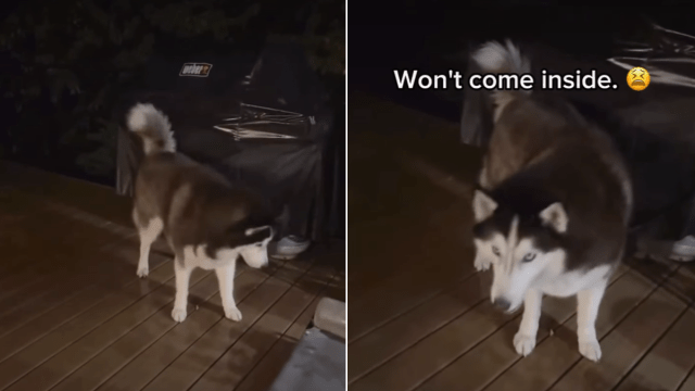 Quarter to four in the morning is prime deep sleep time for most people, but Archer operates on his own clock. On the @siberianderpskies Instagram page, this black and white Husky is seen standing in the pouring rain on a dark patio. He refuses to come inside, forcing his exhausted dad to investigate the 3:45 AM commotion. While his sister Leia was likely cozy inside, Archer stayed out to bark up a storm. He decided he needed a specific toy to sleep and that simply could not wait until sunrise.