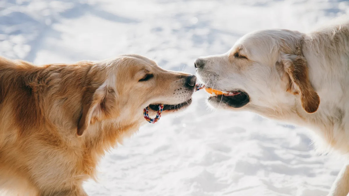 In the next clip, the ball can’t even be seen in the frame, but one golden retriever has the other’s ear in their mouth. In the next clip, one golden retriever has the ball next to their stomach while the other one is trying to get it away with their mouth. The one with the ball next to their stomach responds by kicking and pushing the other golden retriever’s head away with basically all four of their legs and paws.