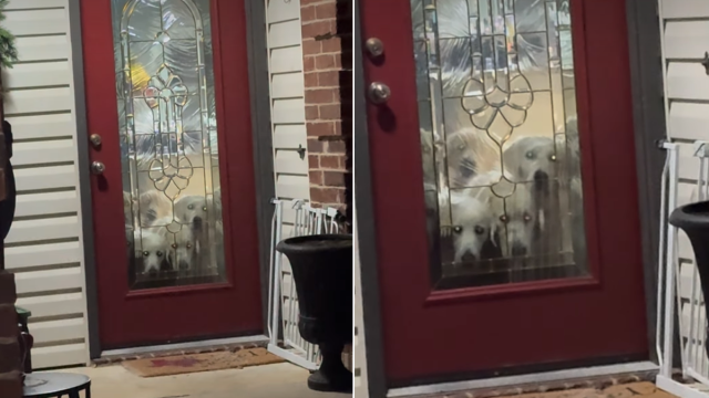 In a cute and funny dog video on Instagram, a bunch of Golden Retrievers stay close to the front door when the owner steps out for grocery shopping. The caption reads, “Heading out for groceries… They were not invited. They are not impressed.”