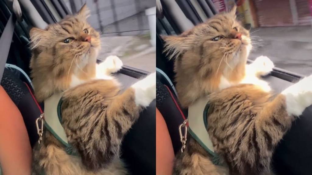 Cat can’t get enough of car ride in adorable video
