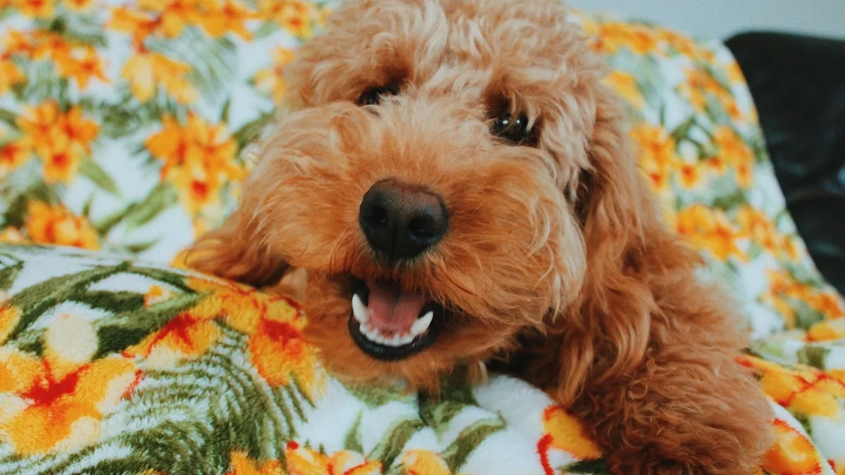 A handsome Doodle dog lies on a bed comforter with his paws crossed.Image via Unsplash