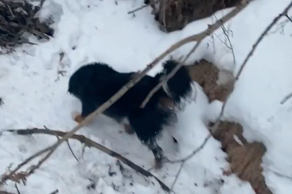 Jason then shares what appears to be kibble with the dog, who hurriedly eats every bite in the clip. Jason told AP that the dog couldn’t stand and appeared very unwell overall, so he and Kris contacted their son, Adam, and asked him to meet them with rescue supplies so they could bring the dog to safety.