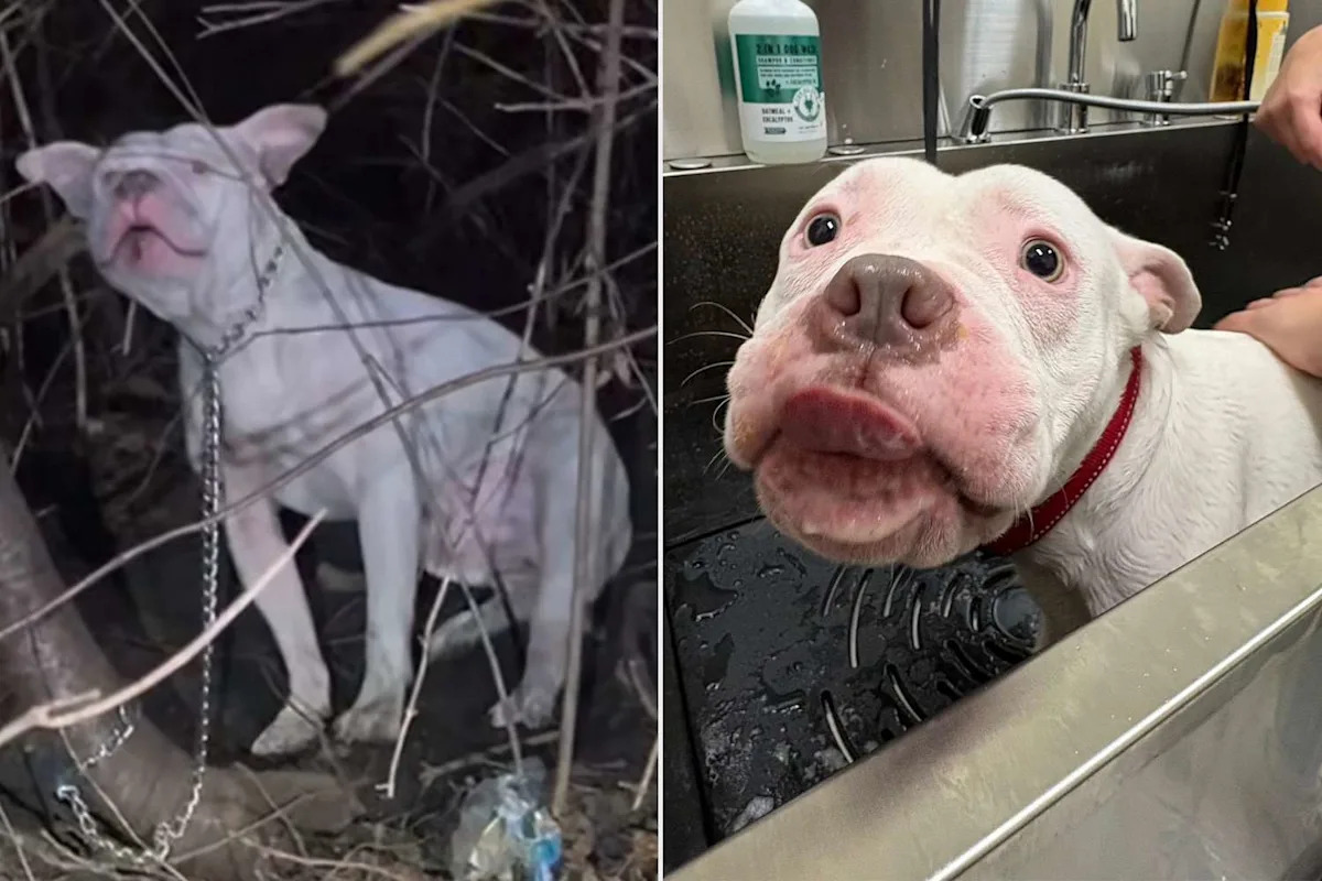 A man found the pup, a white pit bull mix, chained up next to a bike path while he was out walking his own dog during “freezing weather” in Amsterdam, N.Y., on Dec. 1, 2025, according to the Amsterdam Police Department (APD)