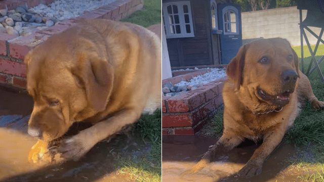 On Instagram, user @truffleupagus_ shared a video of Truffles, an AKC Red Fox English Labrador, and a tiny human partner in crime hanging out beside a shallow pool of muddy water in the yard.