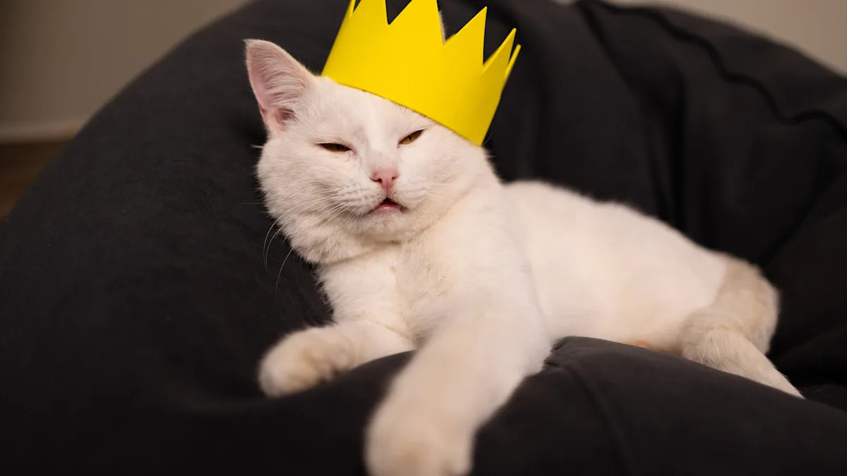 A fancy cat in a crown and cape.Image via Getty Images/Nils Jacobi
