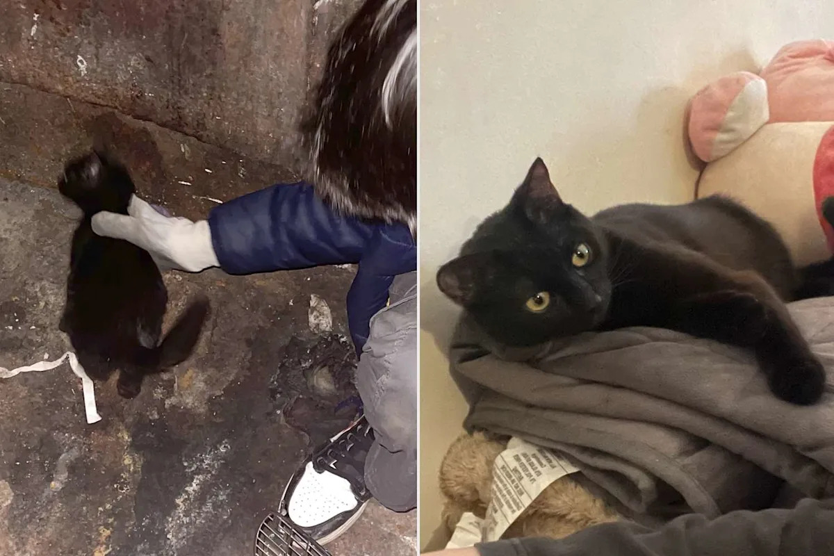 “We dropped down a can of tuna for her to eat since she looked hungry, so my boyfriend sat in the dumpster for a bit and began feeding her tuna from his glove to gain her trust,” Crowley tells PEOPLE. “Eventually, she completely let her guard down, rubbing against his hand and circling him. He had the carrier open next to him, and eventually she just walked right in, and we shut the door behind her.”