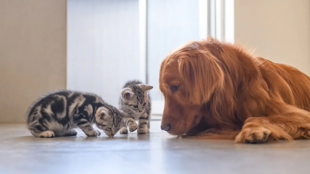A Golden Retriever sniffing a tiny kitten.Image via Shutterstock/Chendongshan