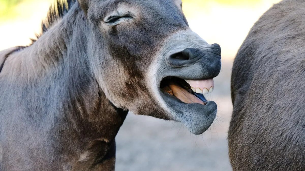 A miniature donkey making a funny face. Image via Shutterstock/Wayne_Martin