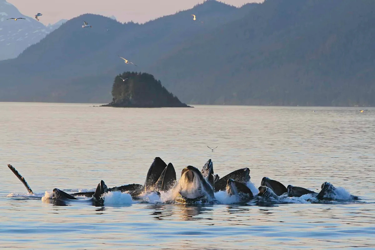 It begins with the whales diving deep below a school of fish. Then, they release bubbles underwater to corral, concentrate, and disorient the fish, often pushing them toward the surface before lunging up through the bubble net. One whale usually leads the hunt, followed by another whale or the rest of the group. In cooperative bubble-net feeding, one whale may create the bubble net while other whales can help herd prey with vocalizations or body positioning before the group lunges upward through the concentrated school. This keeps the fish trapped in one place and makes them easier to swallow!