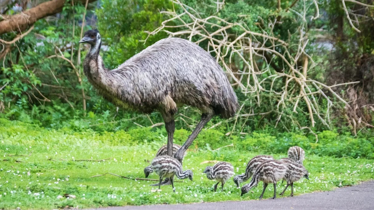 An emu walking with baby chicks.Image via Shutterstock/Ken Griffiths