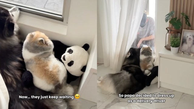 Owner pretends to be the delivery guy for dogs