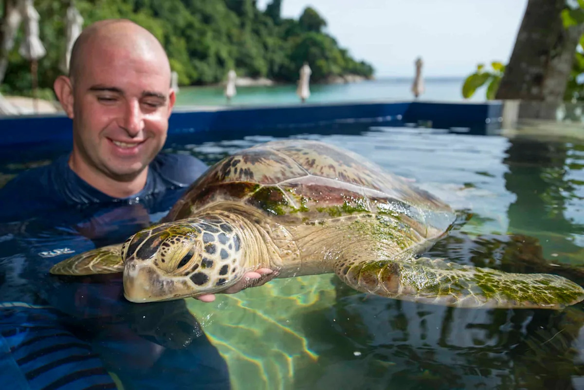 Here’s how Scott describes a typical day on his job: “My role is a dynamic mix of veterinary care, ecological restoration, and public education. A typical day could start with a health check on sea turtles in our rehabilitation centre, followed by leading a coral planting session where guests help propagate and replant species onto our house reef. We also constantly monitor the marine park for bleaching events or injured wildlife and dedicate significant time to educating guests on how to enjoy the reef without damaging it—ensuring they understand the ‘why’ behind our conservation actions.”