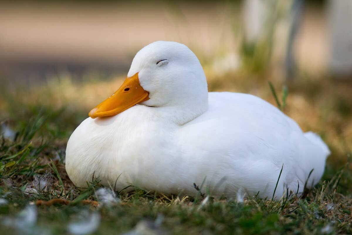 A close-up of a white duck standing in the grass.Image via Shutterstock/jjvxphotography