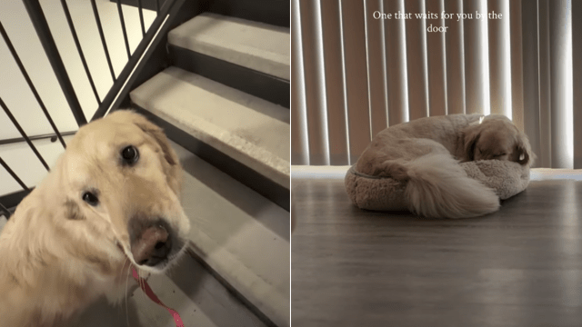 As the video continues, it leans into the kind of loyalty that often goes unnoticed. The Golden Retriever curls up on a bed near the door, paired with the words: “One that waits for you by the door.” Another scene shows him walking alongside his owner down a hallway, steady and close.