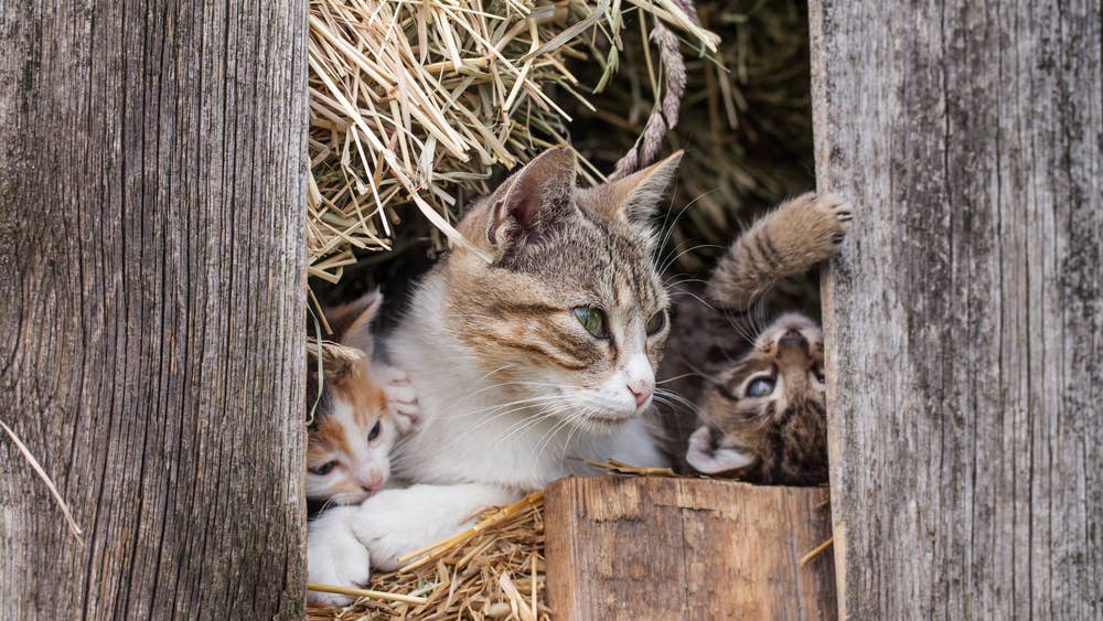 A mama cat gives birth to her kittens inside a chicken coop.