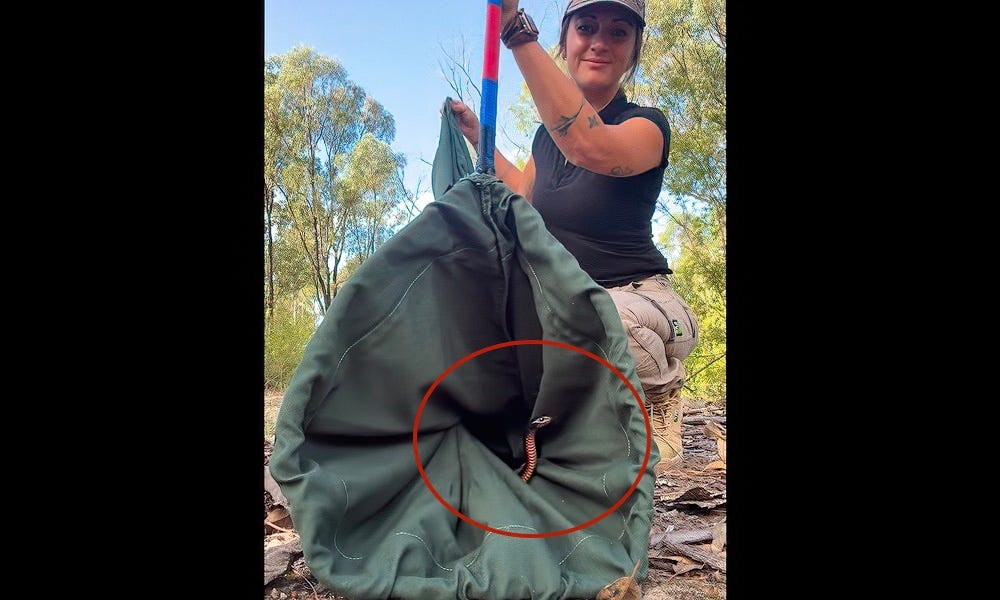 The accompanying footage shows Bronte Hillen, a Newcastle snake relocation expert, trying to spill one of the venomous reptiles from the bag, but it keeps slithering back inside.